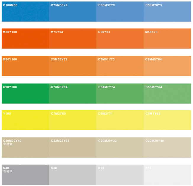 輔助色是企業(yè)標(biāo)準(zhǔn)色的輔助與補(bǔ)充,以適應(yīng)企業(yè)視覺形象的豐富與推廣,適應(yīng)企業(yè)形象的宣傳和應(yīng)用。為使公司形象統(tǒng)一而富有變化特制定輔助色系配合應(yīng)用。
